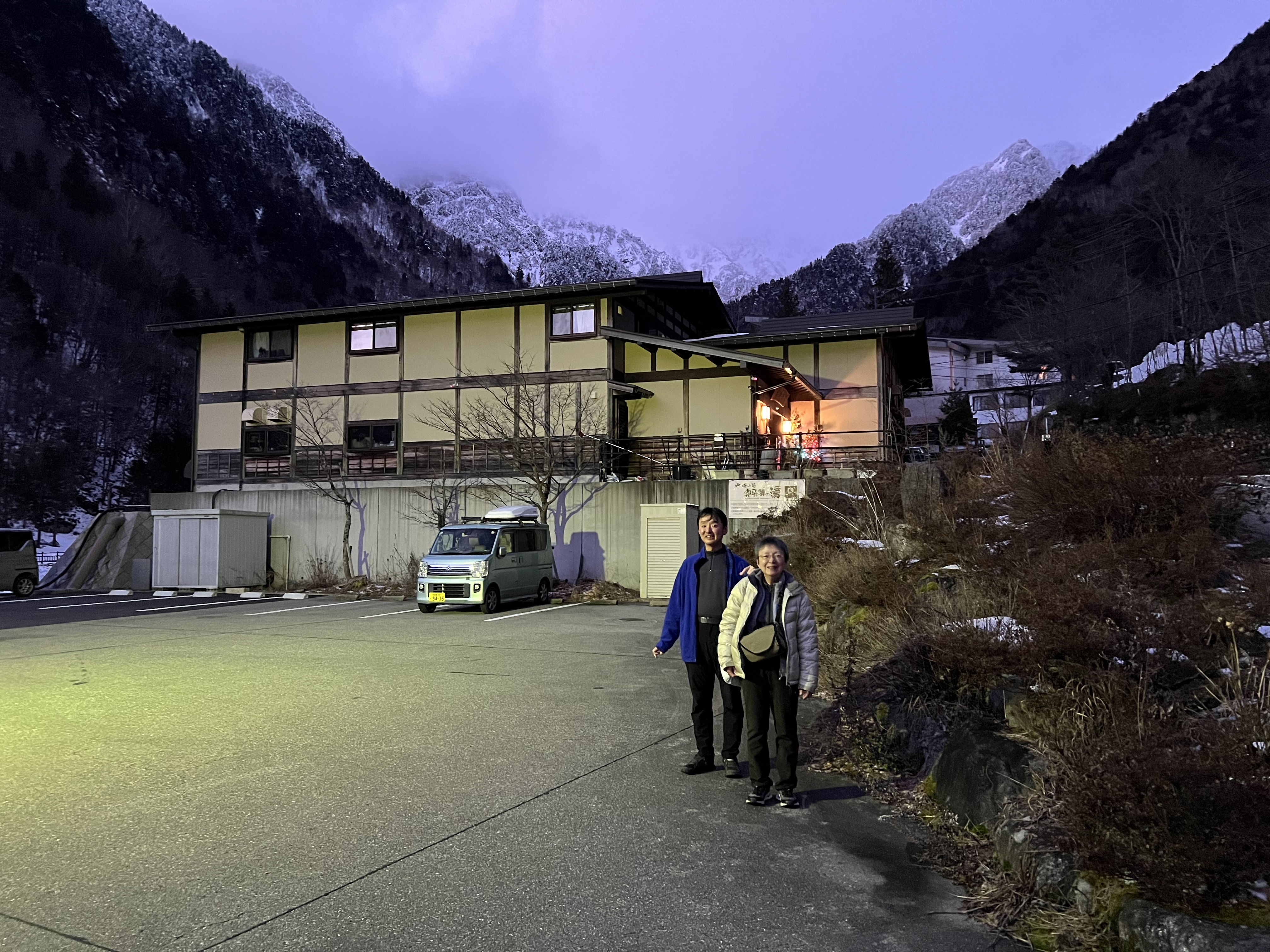 | 本日(2025/12/31)の宿。 | 宿の反対側。焼岳方面から白い噴煙… |